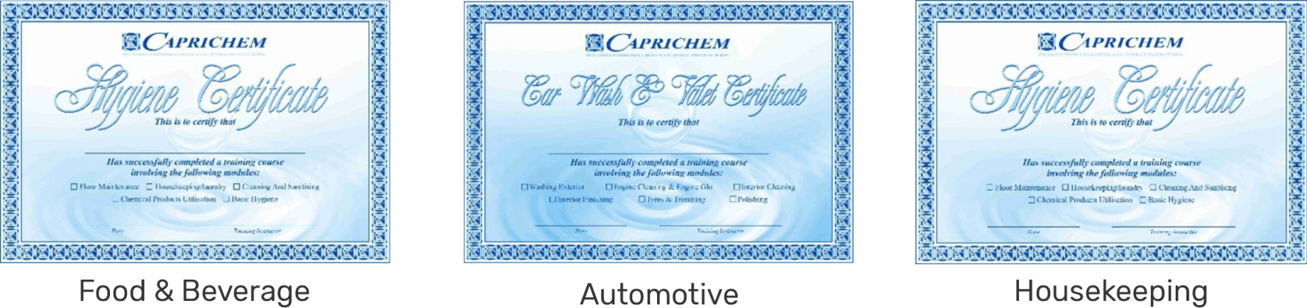 As an added service to our customers, Caprichem has invested in a very large in-house training facility, whereby we offer theoretical as well as practical training. When training is not possible from our training facility, we offer the same service to our customers on site. Whether it is a food factory, valet centre, school or a retirement home for HACCP training, vehicle cleaning or floorcare training, our sales representative will be fully equipped to provide off site staff training. When sales representatives are employed by Caprichem they write in-house exams and are trained to become qualified before servicing existing and new clients. We will always do our best to make sure that our customers staff are using the correct products in the correct way for the purpose intended. Once training is completed, a certificate is issued to each worker that attended the training relevant to the industry ie: food & beverage, automotive, hospitality, etc. This is very necessary for it uplifts one’s spirit and keeps all staff motivated.